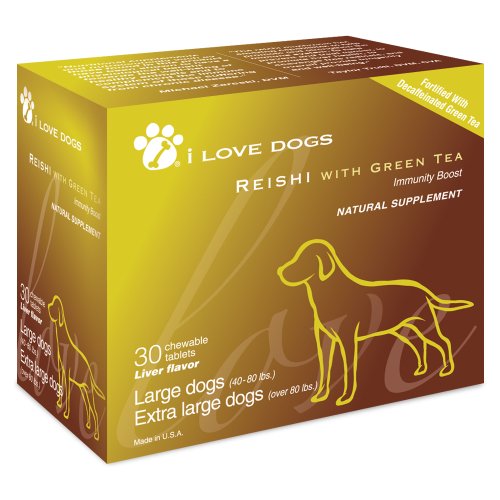 i Love Dogs Reishi with Green Tea is a premium, veterinarian-formulated supplement that offers immunity support for aging dogs as well as dogs with weak immune systems, chronic illness, or dogs that are subject to ongoing medical treatment. It also helps to reduce stress and calm nerves of anxious or hyperactive dogs. Reishi is an herbal mushroom known for its many health benefits. The polysaccharides in reishi have been found to be helpful with many different conditions related to aging. Reishi is non-toxic, and when taken regularly, it promotes normal organ function. It is also known for its ability to regulate the immune system. Reishi is known to stimulate the production of potent natural anti-cancer substances that inhibit the growth of tumors. It can prevent the growth of secondary cancers, and reduces side-effects of chemotherapy and radiotherapy. Your dog needs i Love Dogs Reishi with Green Tea if he is showing signs of aging, has cancer, is undergoing chemotherapy or radiation, has heart problems, suffers from allergies, is undergoing treatment for infection, or has a weak immune system.